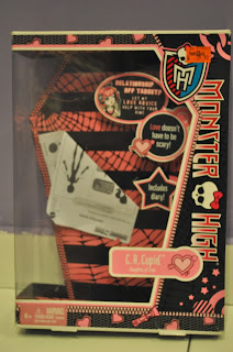 Cupid's box is mostly pink. It says on the box that Cupid is the daughter of Eros for those of you who don't know. On the back of the box it says on top Be Yourself. Be Unique. Be a Monster and there are some other things that you can read in the pictures. You can also read Cupid's profile in the pictures. Sorry for the blurry pics. And finally at the bottom of the box there are some other dolls.